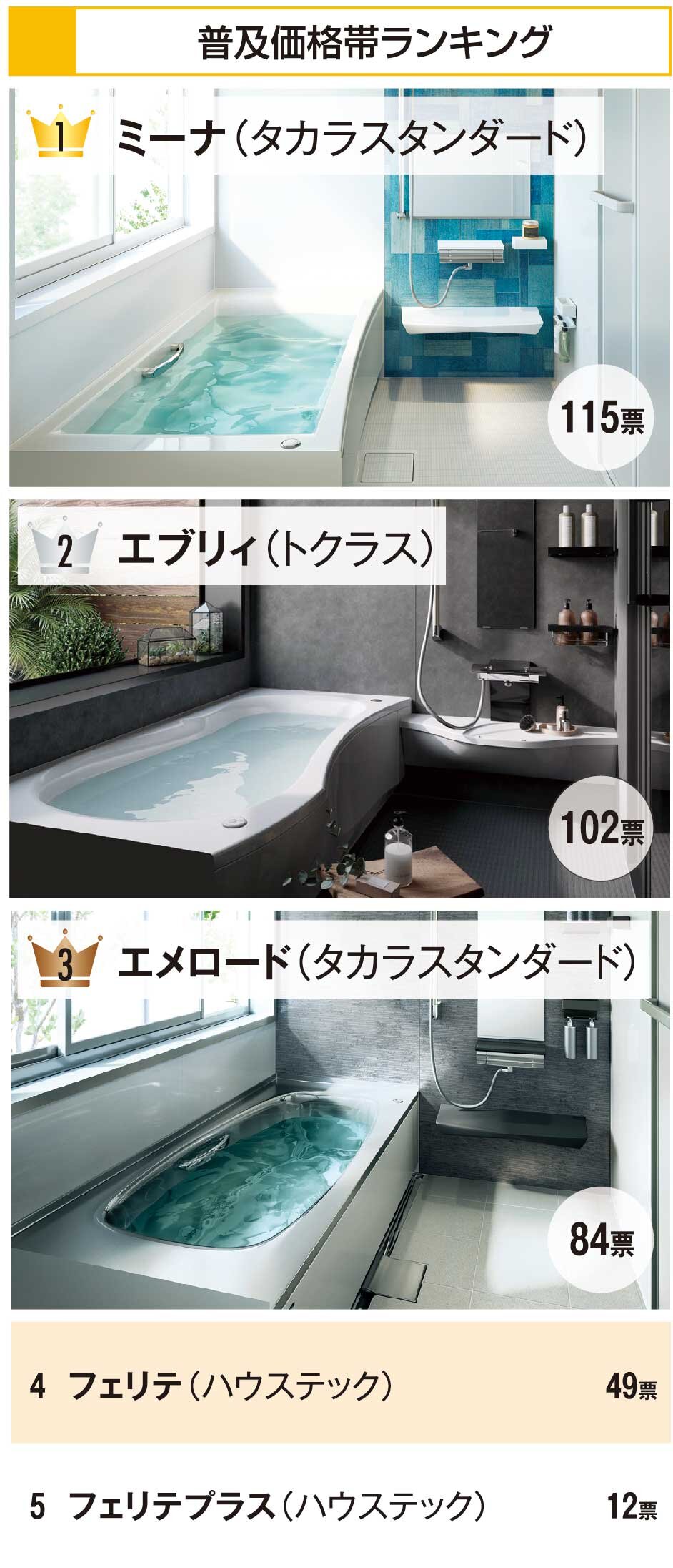 普及価格帯1位はタカラスタンダードのミーナだ。115票獲得、全価格帯では3位になる。断熱性や耐震性といった優れた機能性を持ちながら、価格を抑えられることが人気の理由だ。
