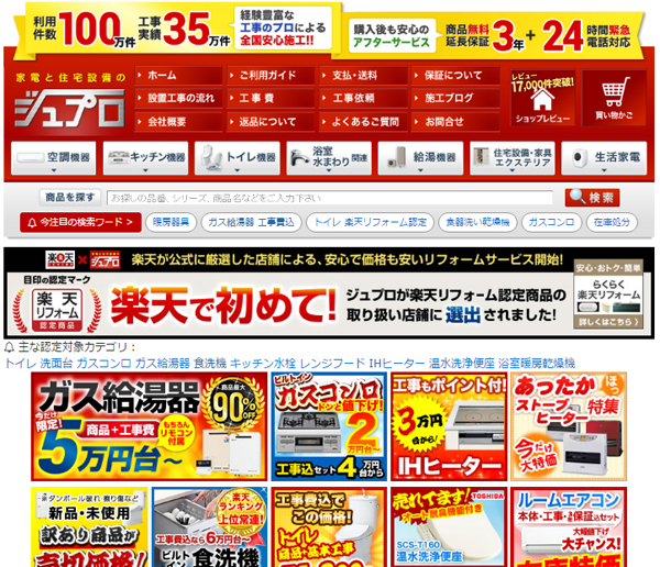 2つ目の強みが価格の割安さ。例えば「ジュプロ楽天市場店」では「ガス給湯器、最大90%OFF」「ビルトインガスコンロ、ドンと値下げ2万円台」など安さを訴求する文言がずらりと並ぶ。「ネットでは安さが最も重要。常に一番安いラインに追従している」
