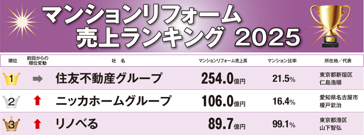本紙は、マンション専有部のリフォーム売上高が大きい企業を集計し、ランキングにまとめた。1位は住友不動産グループ(東京都新宿区)で、売上高は254億円となった。