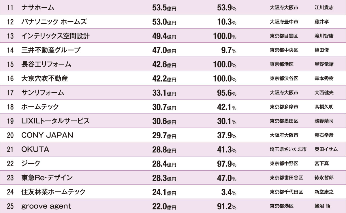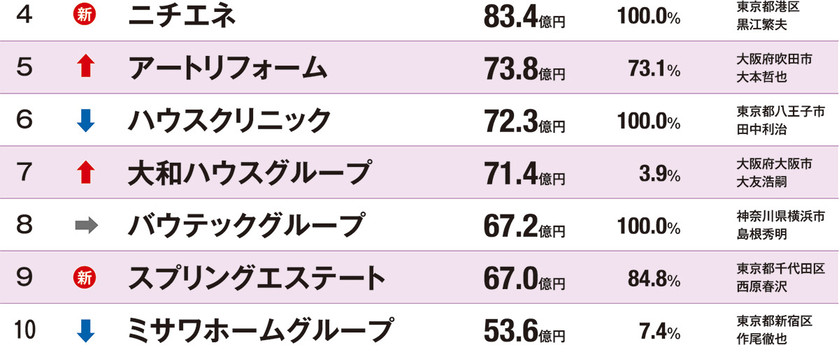 5位のアートリフォーム(大阪府吹田市)は売上高が61億9000万円から73億8000万円へと大きく伸び、昨年の6位から5位へと順位を上げた。大本哲也社長は「東京・大阪の都市部中心のエリア展開でマンション比率がもともと高く、会社の成長がそのままマンション売上の伸長に直結しました。また、不動産仲介会社との提携で中古物件を買ってリフォームする案件紹介が売上の約半分を占めています。さらに関東エリアで需要を広げられたことが大きな要因です」と話す。