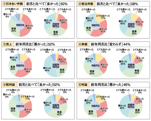 - 引き合い件数は、前年同月比では「普通(変わらなかった)」、「良かった」、「悪かった」が全体をほぼ3等分した。