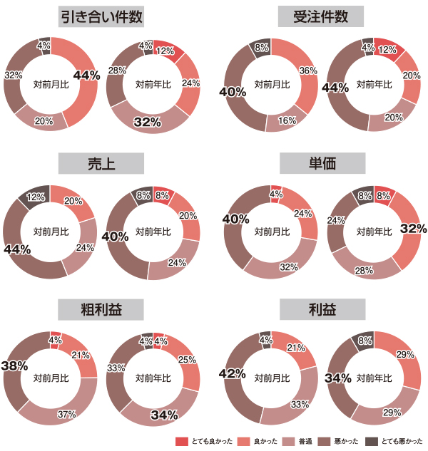 - 受注件数は、前月比で「悪い」48%に対し、「良い」は36%。前年比でも「悪い」48%が「良い」32%より多かった。